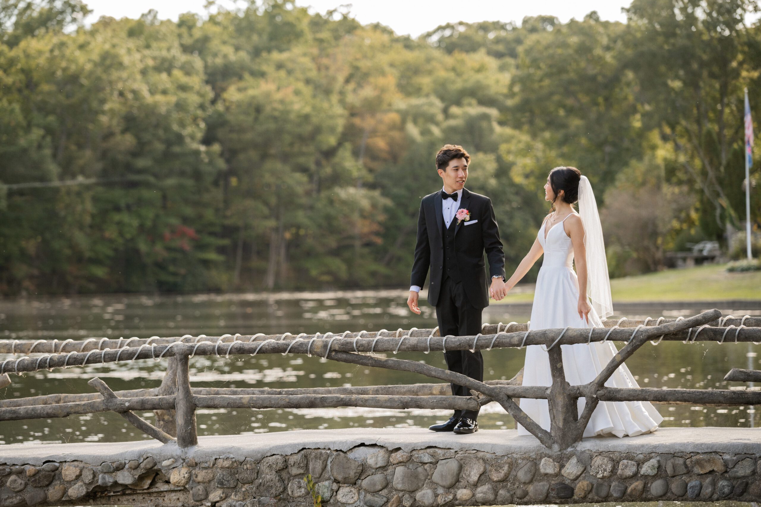 One of the most recognizable Perona Farms wedding photo locations is the small island just across the street from the main property. Accessible by a short bridge, this tucked-away area provides a peaceful setting that feels slightly removed from the bustle of the wedding. The surrounding greenery and water give the space a quiet, storybook quality that works beautifully for couple portraits. Because it feels more secluded, many photographers bring couples here for a few relaxed moments away from the crowd while still staying close to the venue.